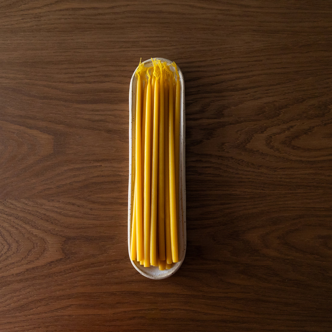 The Mellisa Thin Candles & Tray Set pairs 15 of our signature hand-poured beeswax candles...