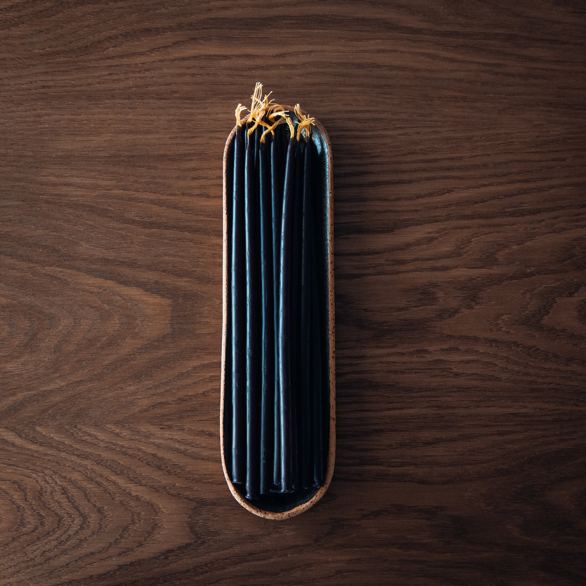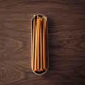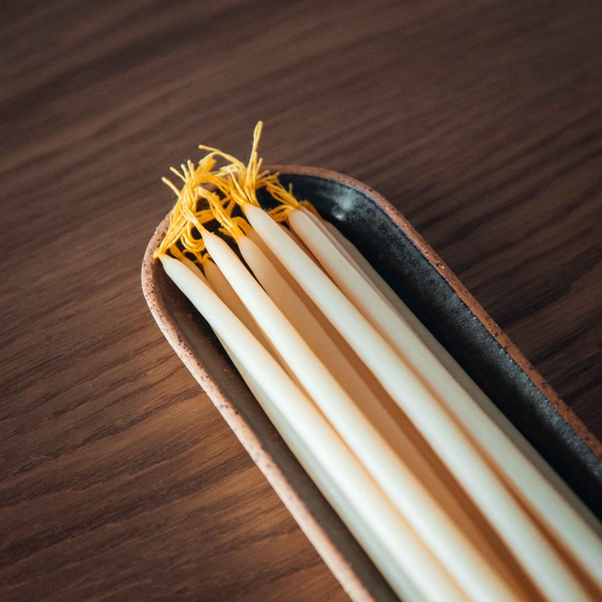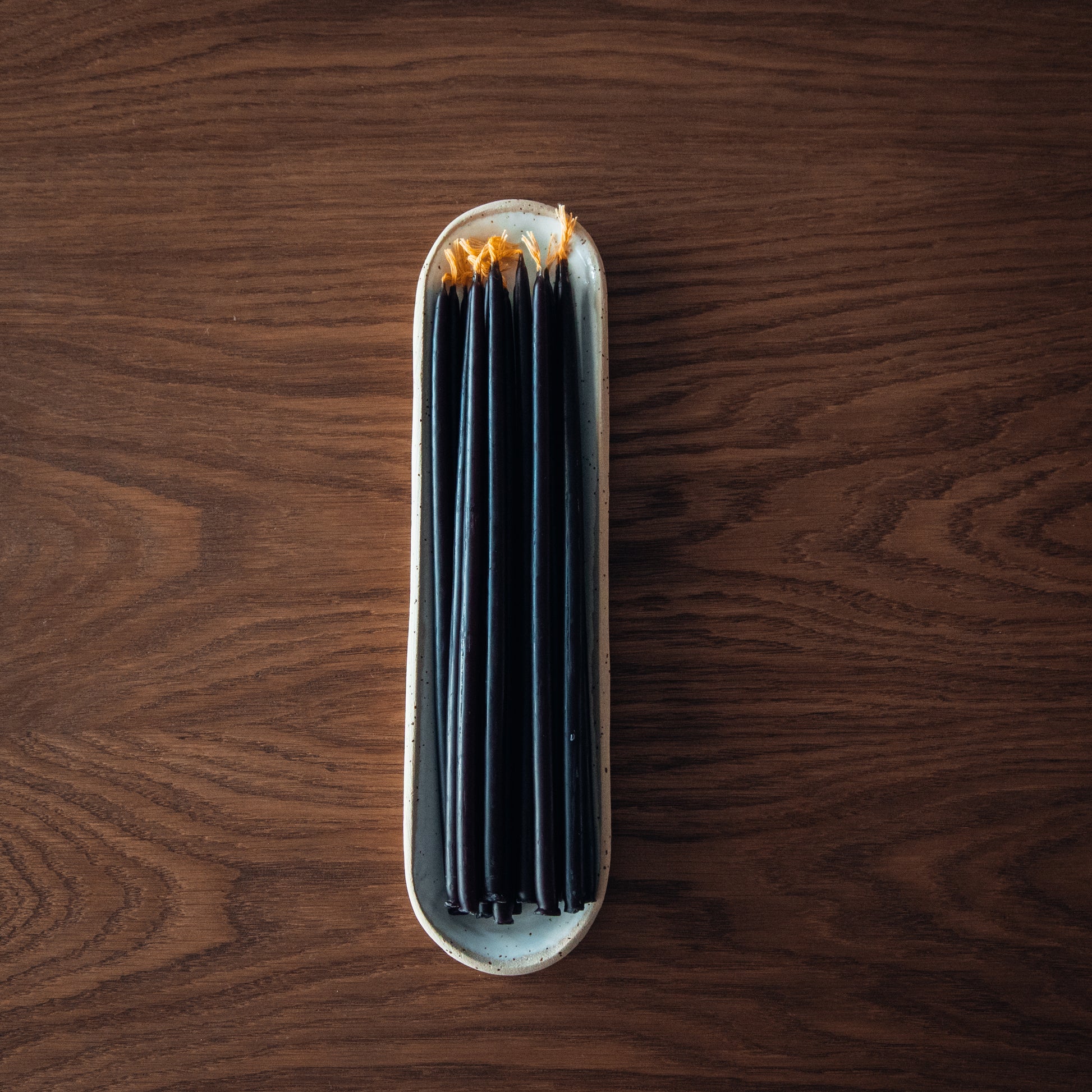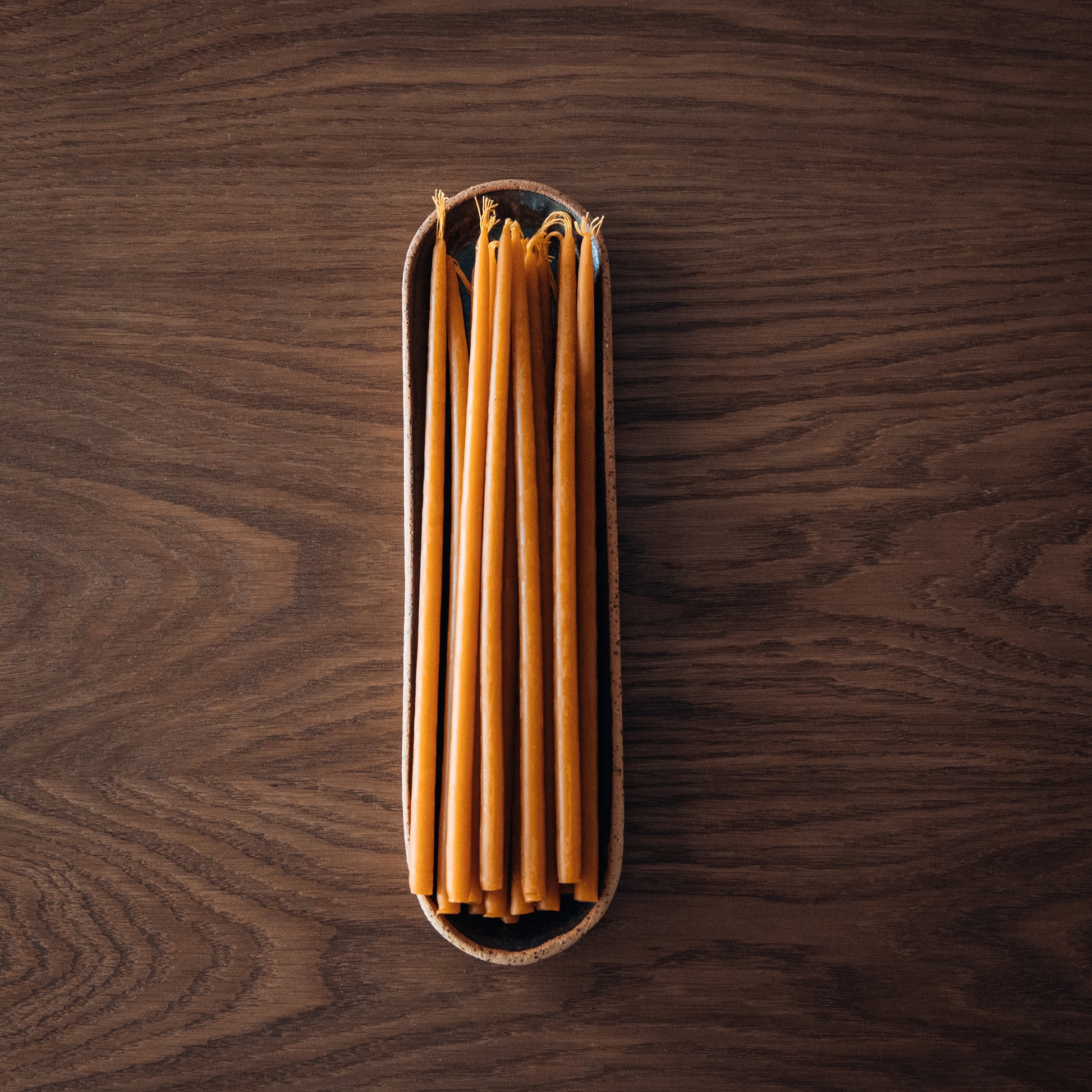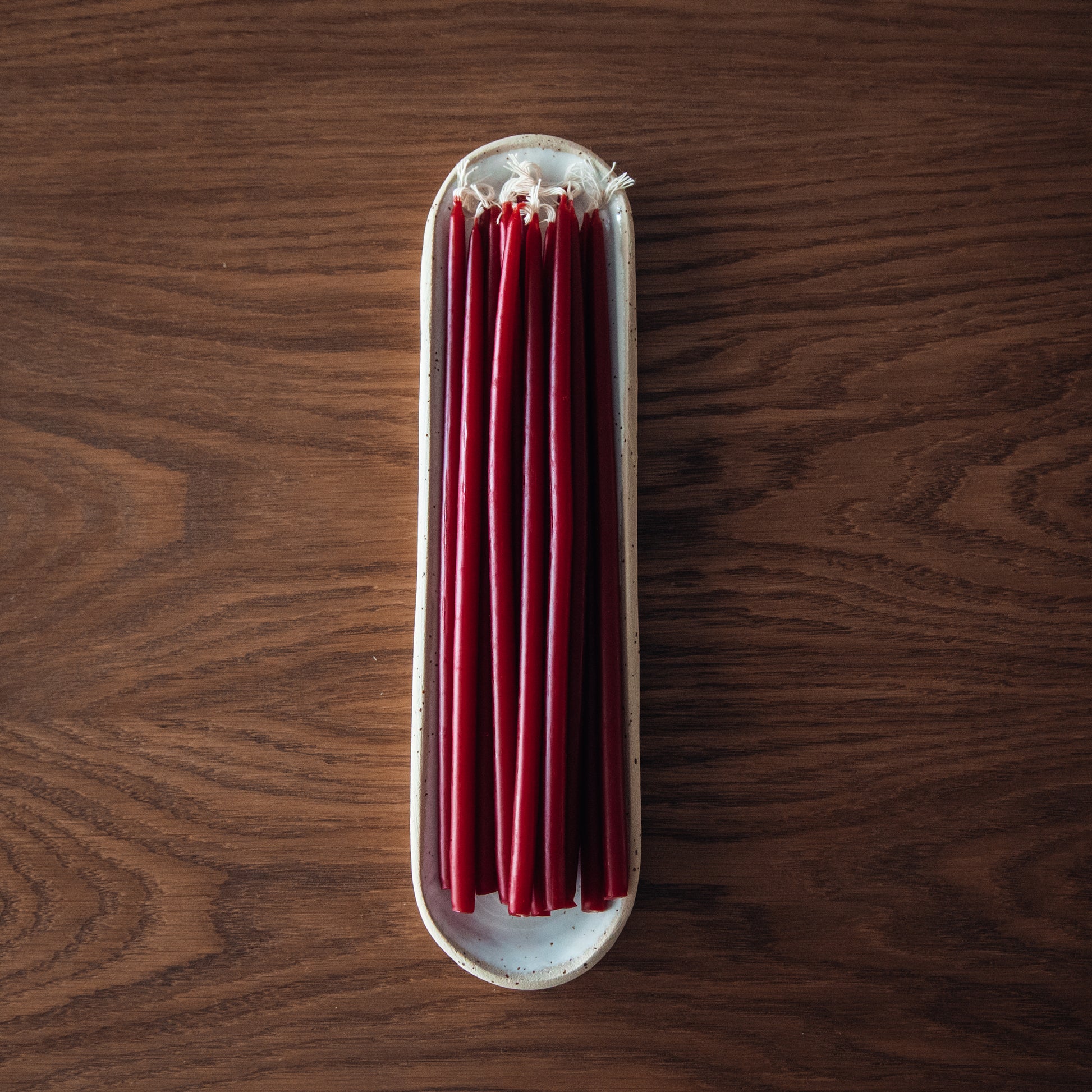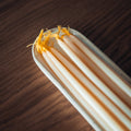 The Mellisa Thin Candles & Tray Set pairs 15 of our signature hand-poured beeswax candles with a handcrafted stoneware tray made to hold them beautifully. Each tray features smooth, rounded forms with soft milky tones and light speckles, giving it a rustic yet modern charm.