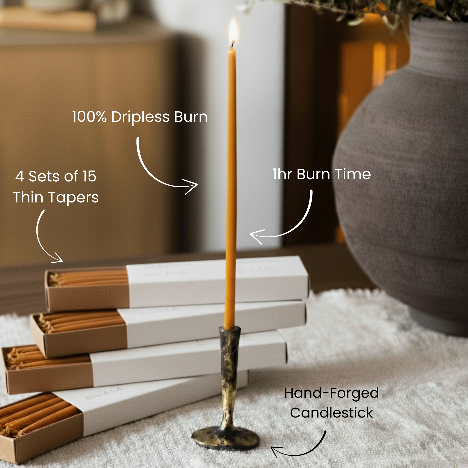 Light a candle each evening to create a calming ritual with the soft glow of our Mini Brass Candlestick and Beeswax Thin Candles*—perfect for journaling, meditation, or simply quiet evenings of stillness.